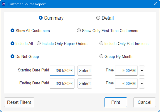 In the Marketing section of MaxxTraxx Setups you can add and update your customer sources. These sources give you a way to track how new customers found you and also give them Parts and or Labor discounts.