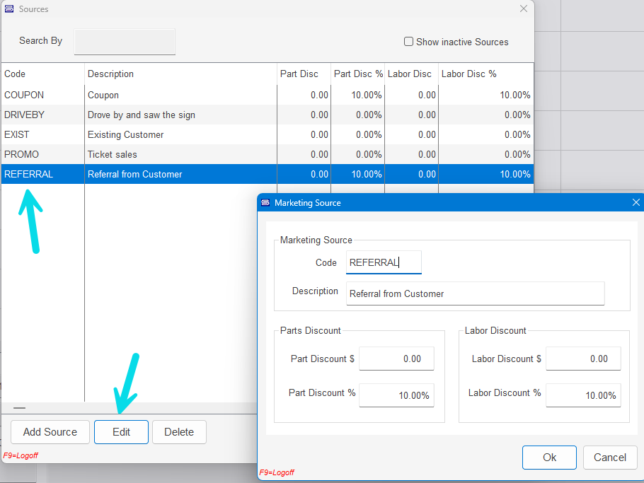 Here you can edit and or add new Sources by selecting one of the options at the bottom of the window. For each source you can update the Code used to search for the source and edit the description. You can also add Parts and or Labor discounts by dollar amount or percentage. These will be applied when adding the customer source to an RO.