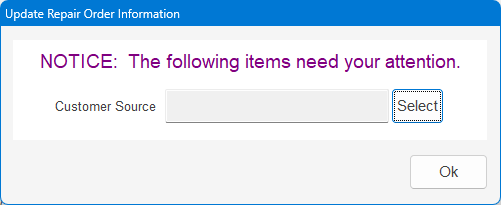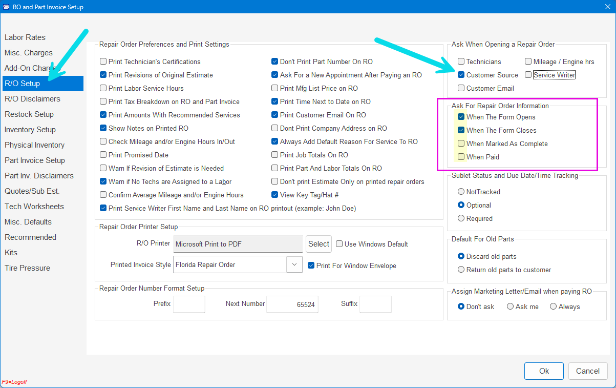 Once those are set up you can set up a prompt to ask you for Customer Source each time you open and or close an RO. This can be done by going to Setups > Repair Orders and Part Invoices > RO Setup. The image below shows where this option is and where you can choose when to get prompted.