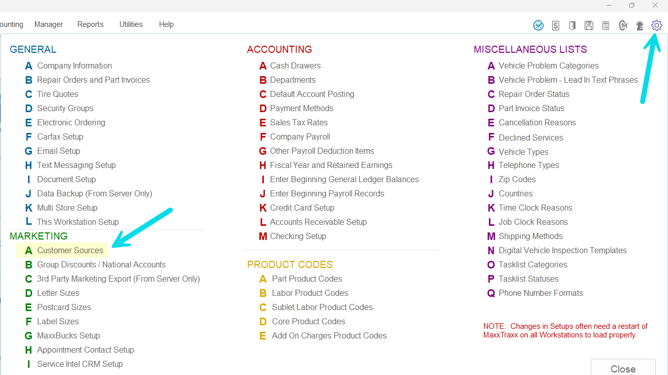 To find this section you will first navigate to MaxxTraxx Setups, the gear icon in the upper right hand corner of MaxxTraxx. From here you will open the Customer Sources section, A in the Marketing section.