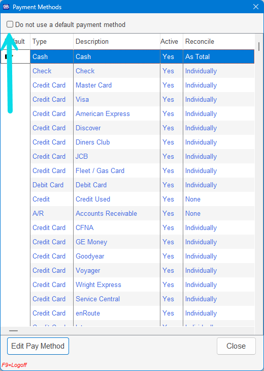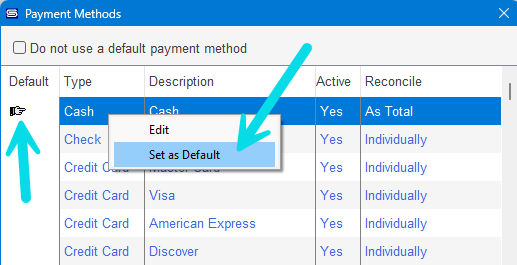 a. To set a default method of payment you can highlight the one you would like to set and the right click and choose set as default
