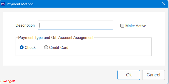 b. The black ones, towards the bottom of the list, are fully editable. You can add a description, choose to make it active or not and decide if it is a check or credit card payment type.